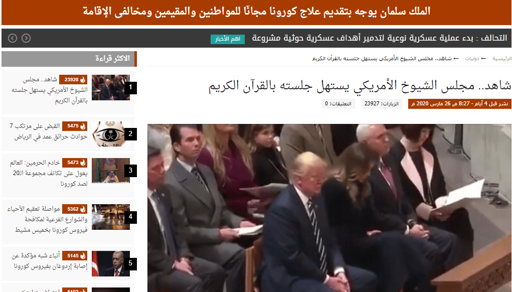 Al-Senani, M. [@MusaadAlSenani]. (2020, March 26).مجلس الشيوخ الامريكي بحضور الرئيس #ترمب يفتتحون جلستهم بالقرآن الكريم. [Tweet]. Twitter. https://twitter.com/MusaadAlSenani/status/1243218785391255552